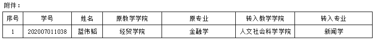 蓝伟韬同学于2022年3月应征入伍,现退役复学。按照《普通高等学校学生管理规定》(中华人民共和国教育部令第41号)和学校相关管理规定,经学生本人申请,二级学院审核同意,教务处复核审批,现同意蓝伟韬同学转专业的申请,予以公示,名单见附件。