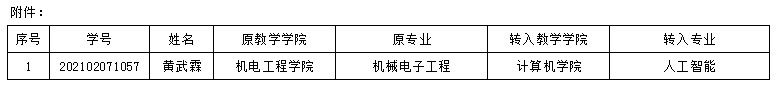 黄武霖同学于2022年11月应征入伍,现退役复学。按照《普通高等学校学生管理规定》(中华人民共和国教育部令第41号)和学校相关管理规定,经学生本人申请,二级学院审核同意,教务处复核审批,现同意黄武霖同学转专业的申请,予以公示,名单见附件。