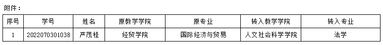 严茂桂同学于2023年4月应征入伍,现退役复学。按照《普通高等学校学生管理规定》(中华人民共和国教育部令第41号)和学校相关管理规定,经学生本人申请,二级学院审核同意,教务处复核审批,现同意严茂桂同学转专业的申请,予以公示,名单见附件。