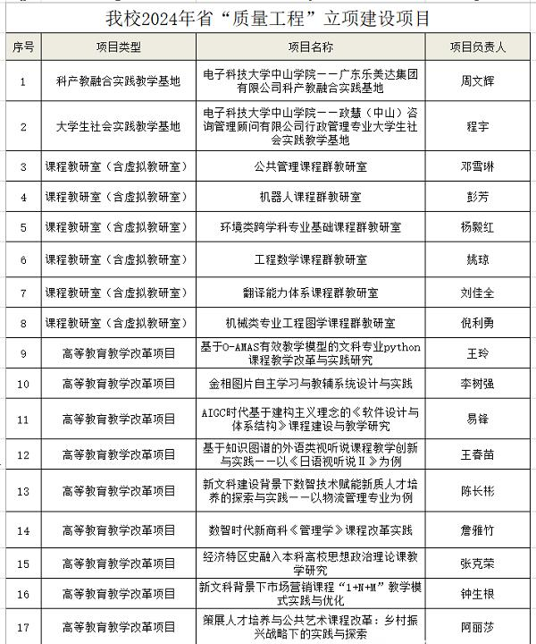近日,广东省教育厅发布2024年度广东省本科高校教学质量与教学改革工程(简称“质量工程”)项目立项建设公示名单,sunbet申搏推荐的实践教学基地、课程教研室等17个项目全部上榜,立项率达100%。