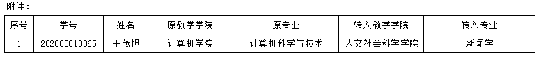 王茂旭同学于2022年4月应征入伍,现退役复学。按照《普通高等学校学生管理规定》(中华人民共和国教育部令第41号)和学校相关管理规定,经学生本人申请,二级学院审核同意,教务处复核审批,现同意王茂旭同学转专业的申请,予以公示,名单见附件。