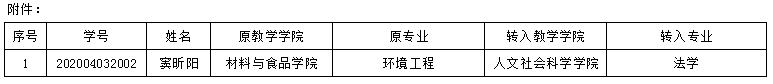 窦昕阳同学于2023年10月创业休学,现已复学。按照《普通高等学校学生管理规定》(中华人民共和国教育部令第41号)和学校相关管理规定,经学生本人申请,二级学院审核同意,教务处复核审批,现同意窦昕阳同学转专业的申请,予以公示,名单见附件。