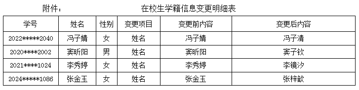 现有冯子婧等4名全日制普通本科在校生提出变更个人学籍信息,经二级学院审核,教务处审批,主管校领导同意,拟同意上述学生的学籍信息变更申请,现予以公示,具体学生名单和学籍信息变更明细见附件。