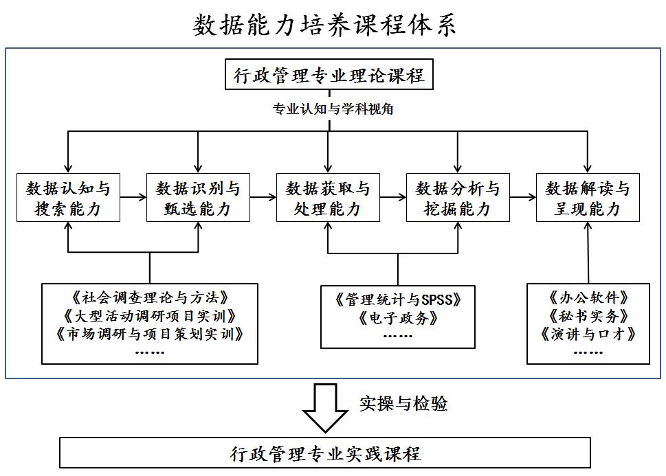 本专业紧紧围绕《国标》规定,设定专业核心课程八门:政治学原理、管理学原理、公共管理学、宪法与行政法、公共经济学、公共政策学、行政组织学、公共部门人力资源管理。在此基础上,行政管理专业的课程体系设置突出数据能力培养这一主线,把学生的应用型人才培养分为两个方面,其一是专业认知和学科思维培养,这是理论课程解决的问题,它为数据能力提供的是洞见、设想、假设与解读;其二是数据运用的社会实践能力和数据实操能力培养。总体构成:有思想、有能力、懂数据、能动手的行政管理专业学生。具体课程设置思路如下: